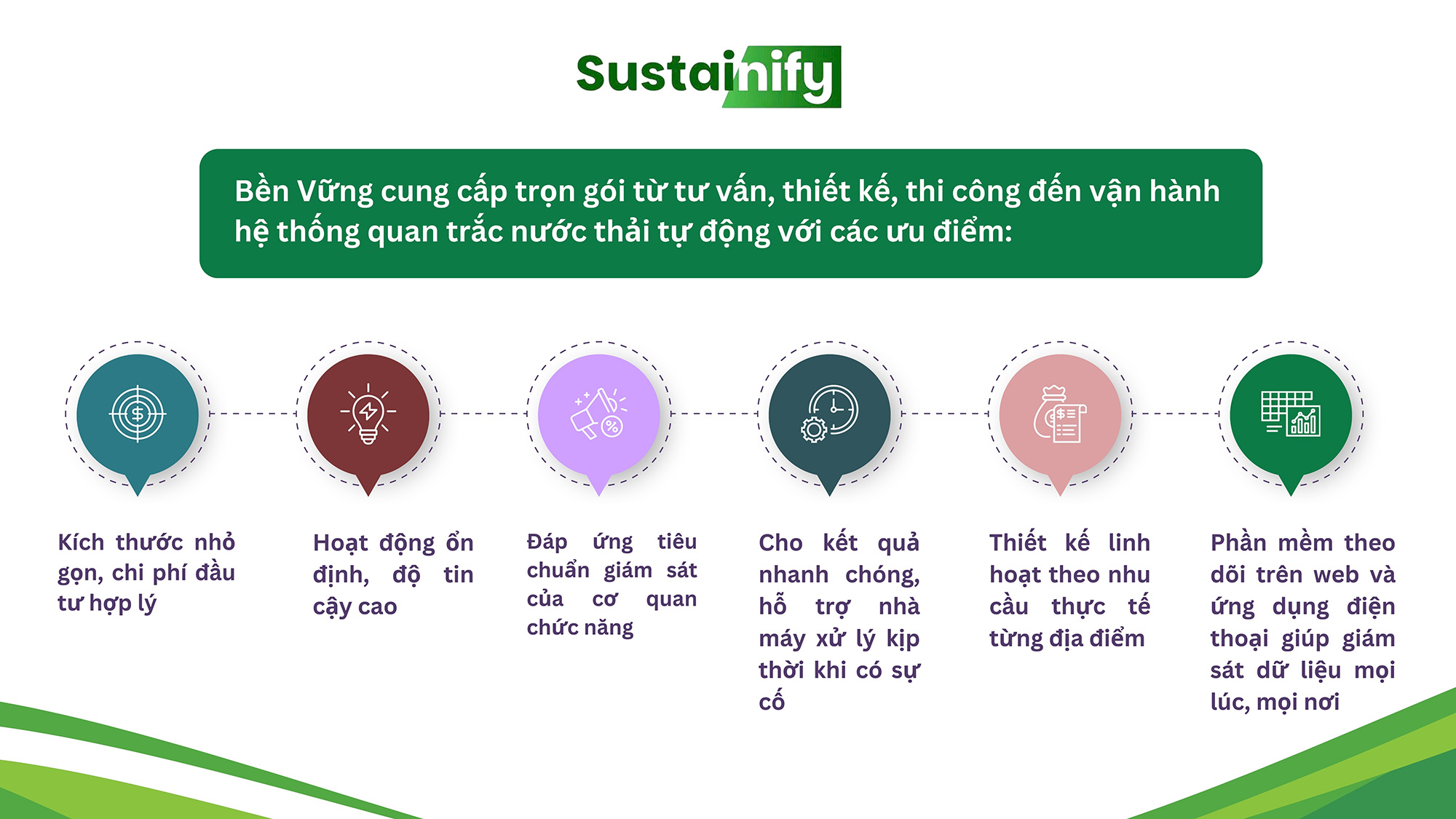 Dựa trên yêu cầu này, Công ty Cổ Phần Công Nghệ Bền Vững Việt Nam thiết kế và tích hợp những thiết bị đo lường đạt chuẩn, công nghệ hiện đại để triển khai giải pháp quan trắc phù hợp cho từng loại nhà máy, đảm bảo tuân thủ đầy đủ quy định của Bộ Nông Nghiệp & Môi trường.
